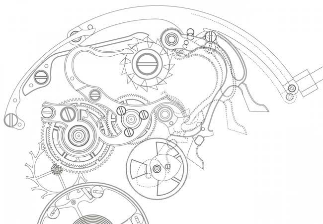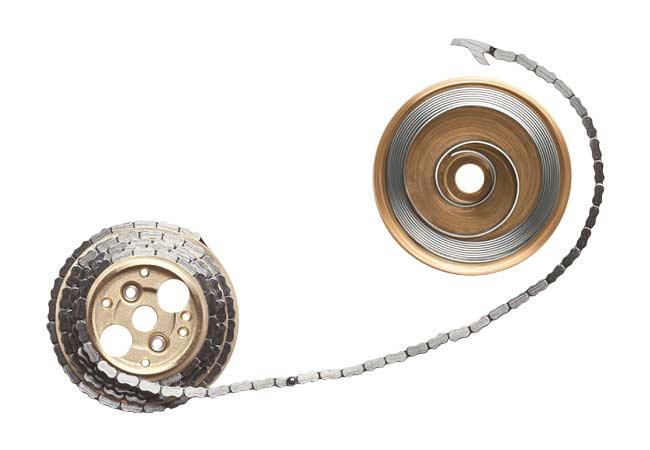 比陀飛輪佔據機芯更大空間的,是幾乎看不見的芝麻鍊傳動系統,由於L133.1機芯上層所加裝的追針與計時結構,幾乎遮蓋了所有空間,因此只能窺見部分發條盒與寶塔輪的底部。透過芝麻鍊系統,能有效均衡發條前段與末端的動能,延長發條穩定動能的時間,對於陀飛輪來說,可謂如虎添翼。