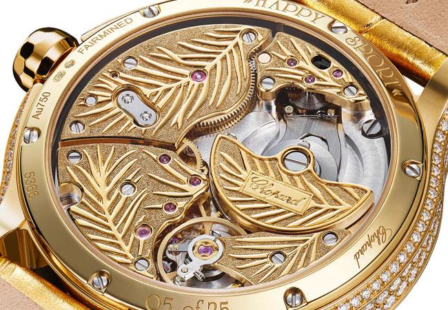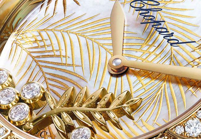 其中的Happy Palm是從坎城金棕櫚獎獎座獲取的靈感,1998年開始蕭邦就是坎城電影節的官方合作夥伴,協助金棕櫚獎座的製作,如今將這個概念複製到手錶上。不只是鑲鑽這麼單純,面盤上細膩的棕櫚葉叢,是採用亞洲漆樹的樹脂,以日本蒔繪技術裝飾,並在濕漆上撒上金粉顆粒,需耗費170個工時才能完成。