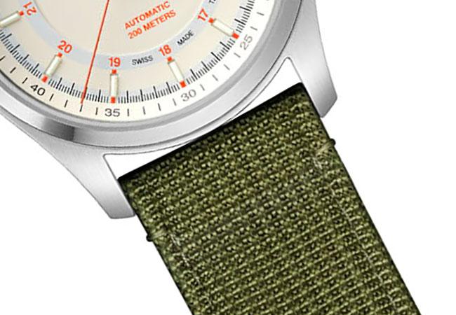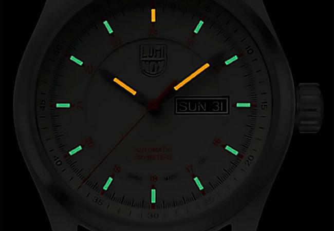 面盤上十二個時標及時分針都嵌有氚氣燈管,高亮度的專利技術可讓燈管自體發光約25年,大三針加上日期與星期的功能配置也很實用,除了和乳白色面盤很互襯的橄欖綠NATO帶之外,還有黑色皮帶和鍊帶兩種版本配置。