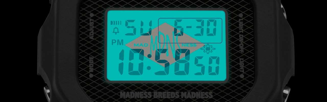 而在外觀設計上,錶殼及錶帶以黑色及墨綠色雙色設計,展現濃厚的軍事風格,錶面上方加入MADNESS品牌字樣及簡潔的網紋設計,而液晶螢幕背光圖樣為紅色的MADNESS經典菱形標誌,更使用與首款G-SHOCK相同的旋入式背蓋設計,並刻上了MADNESS品牌字樣,散發著低調又充滿MADNESS個性的元素。而在功能方面,具備耐衝擊構造、防水200米、多功能鬧鈴、1/100秒計時碼錶、倒數計時…等功能,G-SHOCK X MADNESS限量聯名錶款DW-5000MD全球限量發行2,200隻。