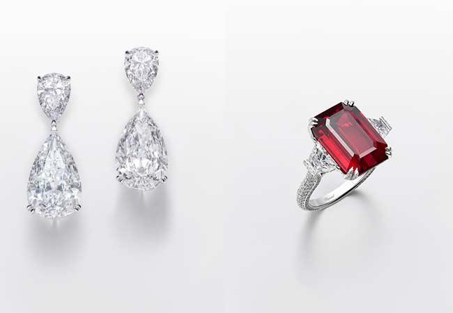 一雙兼具古典韻味與雋永優雅的耳環,由四顆D色無瑕鑽石組成,其中兩顆重逾10克拉,迷人魅力令人難以抗拒。高貴的18K白金戒指點綴一顆美輪美奐的38克拉阿斯切切割單鑽,光線在刻面上反射迴轉,如同令人眩目的萬花筒,綻放無盡光芒。最後,一組祖母綠和鑽石珠寶將精緻的鑽石蕾絲與華麗的祖母綠結合,其中包括裝飾項鏈的逾22克拉臻美祖母綠,向傳統鑲嵌工藝致敬。