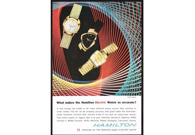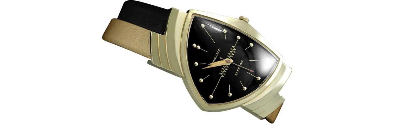 漢米爾頓最讓人印象深刻的,便是品牌在1950年後期推出的電子腕錶Ventura,這款也是枚經典收藏,特殊的三角型錶殼,讓人一見難忘。這枚腕錶裝置著Cal.500的電子機芯,這機芯很特殊,它利用電池的磁力驅動,讓帶著游絲的擺輪轉動,印象中,在1993年看見它,內心有著一股撼動,心想,原來電池與機械也能夠共存活,這可改變了對於電子錶與石英錶之間的差異。若你問我,這腕錶值得典藏嗎?我會告訴你,如果有見到狀態完整的,千萬別錯過,這類腕錶當時算是高級品,自然它的產能就廠內比例來看是少量的,尤其是前面剛剛提出的首批款式,最好能夠找到14K實金的為目標。