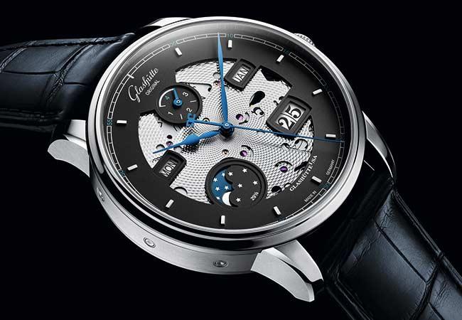 格拉蘇蒂原創新品都展現了嶄新氣象,其中最別開生面的是議員卓越萬年曆腕錶,鏤空的面盤直接顯露出自製的Caliber 36-02自動機芯,並在機板上飾以機刻雕花,紅寶石軸承點綴其間,從中還可以欣賞到猶抱琵琶半遮面的月份、星期、日期碟盤,令人耳目一新。