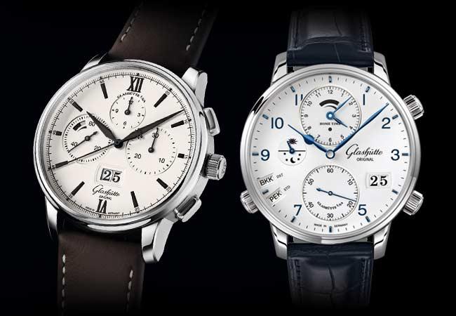 議員世界時間腕錶則是從白金款改為不鏽鋼,價格更為親民。重新設計的面盤將羅馬數字時標改成阿拉伯數字,軌道式分鐘刻度改成簡約的基本設計,9時位置的日夜顯示也以純粹的黑色符號標示。顯示世界時間的面盤雖然無可避免地較基本款複雜,然而,在格拉蘇蒂原創的巧妙設計下,仍給人清新的感受。