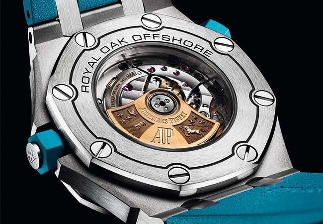 皇家橡樹離岸型潛水錶將單向潛水錶圈移到錶殼裡面,只能藉由10點鐘位置的旋入式錶冠來調整,因此當設定好之後,就不會因為誤觸而改變錶圈的設定。這個設計也為腕錶的外觀帶來了極高的辨識度。而3點鐘位置的錶冠則是用來調校時間與日期。兩個不鏽鋼錶冠的外圍都包覆了綠松石藍的精密陶瓷,散發出如寶石般的高質感。