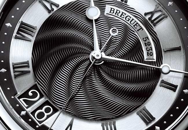 寶璣用許多波浪形的設計來表現Marine 5817大日期腕錶與航海的關係,最明顯的就是面盤上的漩渦狀機刻雕花紋飾,隨著光影的變化,紋飾像是流動的波浪,看久了還會有點迷眩的感覺,視覺效果奇佳。然而,看起來波濤洶湧的立體波浪,其實由幾乎是平面的機刻雕花紋飾所構成。寶璣運用傳統的機刻雕花工藝,透過極淺的雕紋與特殊設計的紋樣,營造出視覺的深度,相當厲害。