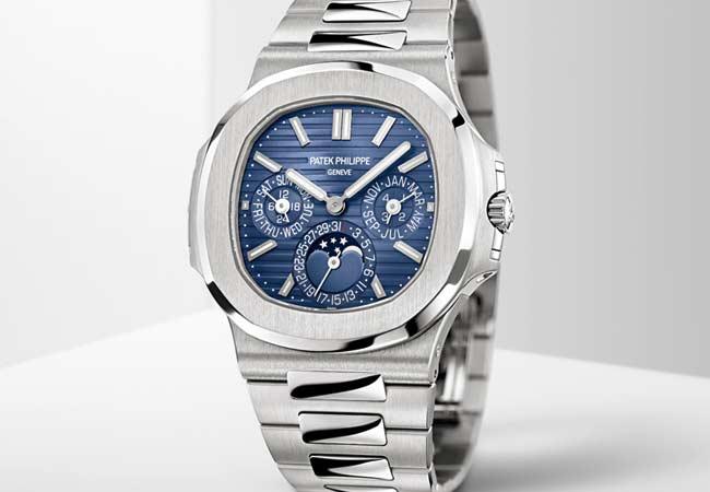 百達翡麗Nautilus系列首次加入萬年曆款式,搭載著名的240自動上弦超薄機芯,加上日曆模組僅厚8.42毫米。錶面綴以橫向凸紋裝飾,並沿用Nautilus四十周年紀念時計的藍色放射狀錶面。腕錶展示最新專利的摺疊扣,設計鮮明,佩戴更加安全。