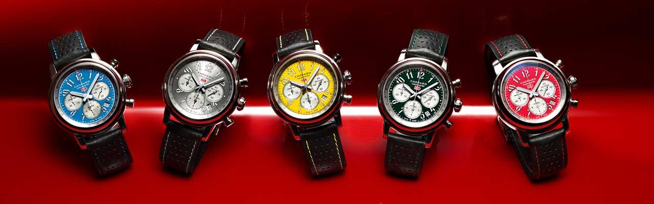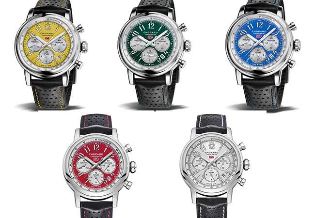 Mille Miglia Racing Colours腕錶推出五彩繽紛的輝煌系列,促使擁有一款錶盤顏色呼應賽車服顏色或甚至搭配車身顏色的典藏錶,集聚高級腕錶及不朽古董賽車的共同點於一身。Mille Miglia Racing Colours腕錶亦是計時碼錶,直徑42毫米的腕錶由蕭邦製錶大師精製組裝而成,每一種錶盤顏色的版本分別限量發行300只。其機芯振頻每小時28800次,且擁有瑞士官方天文台精密時計認證,確保該機芯具備天文台錶的精準度,並具有42小時的動力儲存功能。此系列腕錶的設計靈感源自1927年至1940年之間參加過世上最美麗的賽事的超級跑車。