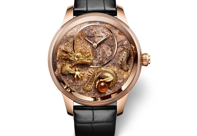 雅克德羅創作出令人讚嘆的裝飾藝術傑作,結合18K黄金的凹凸表面及礦物錶盤,搭配模塑、雕刻呈現出精美細膩的腕錶─浮雕龍時分小針盤腕錶(PETITE HEURE MINUTE RELIEF DRAGON)。