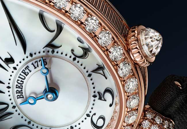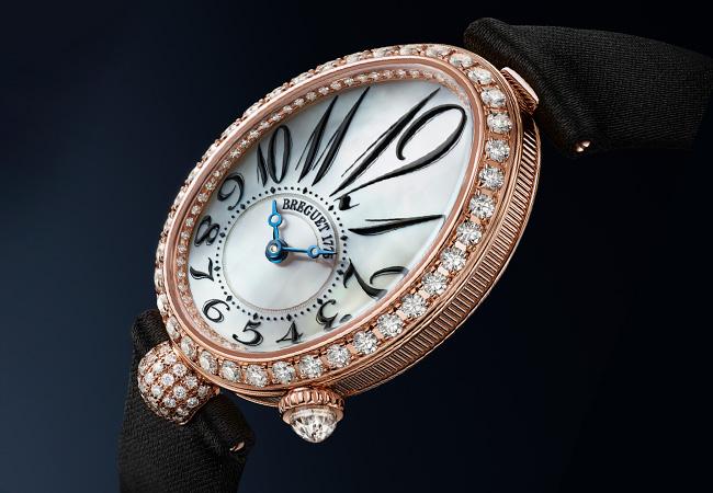 寶璣那不勒斯王后8928腕錶在錶圈、面盤邊緣的垂直面、球形錶耳上共鑲了139顆明亮式切割鑽石,總重約1.255克拉,且錶冠上鑲有另一顆重約0.26克拉的梨形美鑽。