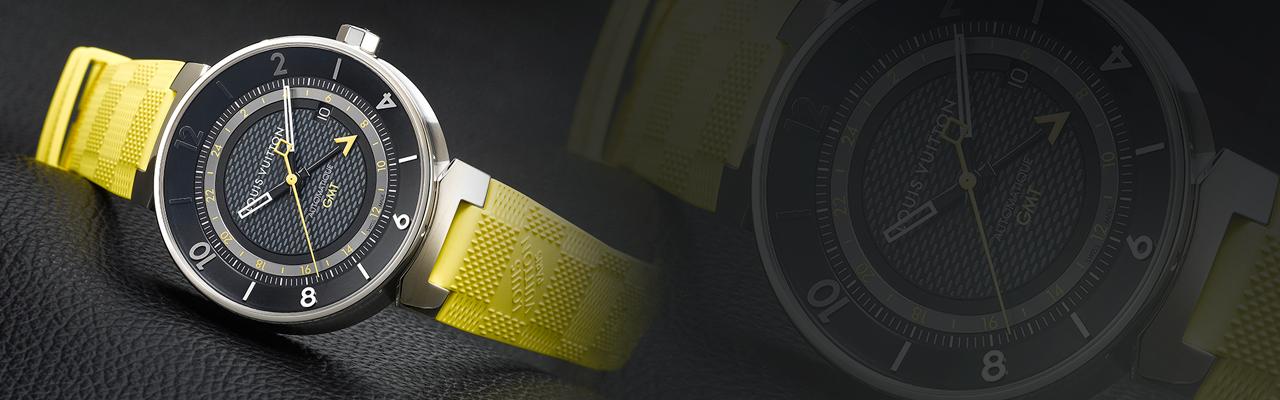 這系列另一個很重要的賣點是可以自行拆裝更換錶帶,事實上現在快拆錶帶也可以跟旅行掛鉤,當人在異地又不想帶好幾支錶出門,多準備幾條錶帶也可以配合旅程中目的隨時換裝,算是快拆錶帶很實際的應用情境。跟時針同軸的GMT指針最常採用的樣式就是色彩鮮豔的箭頭,不過這種樣式隨著設計的高下可能會顯得突兀,所幸LV原本就有個現成的三角形V字logo,這裡直接將它轉換成兩地時間指針末端的箭頭,在錶面的構圖上剛好再自然不過了。