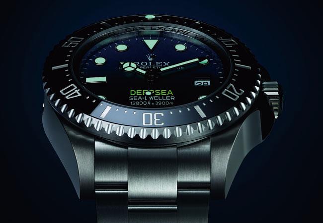新款的Rolex Deepsea同樣以蠔式鋼製成,D-Blue色(深藍漸變至漆黑)的雙色面盤,最早於2014年出現,當時是向深海挑戰探險(Deepsea Challenge)致敬。在此次的探險征途,勞力士與國家地理學會攜手合作,支持電影製作人及探險家詹姆斯.卡麥隆(James Cameron)潛入10,908 米(35,787呎)的深淵,此處為馬里亞納海溝(MarianaTrench)的海洋最深點。面盤上的深藍色轉變為黑色的漸層處理,代表從海平面至深海的顏色;另外面盤上的DEEPSEA字樣,也特別採用卡麥隆搭乘綠色潛艇在水中呈現的顏色。