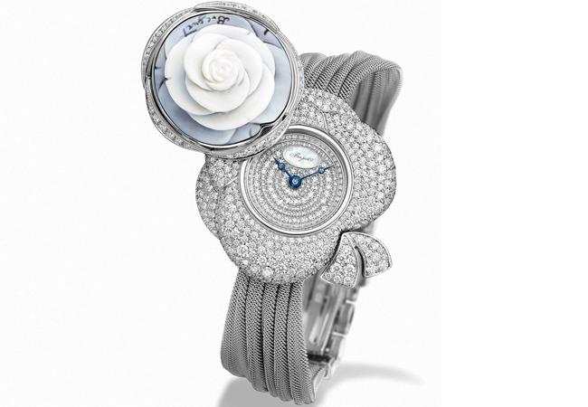 1783年,伊麗莎白‧維傑‧勒布倫為法國王后繪畫人像畫《瑪麗-安托瓦內特與玫瑰》。為紀念這位最著名的尊貴顧客,寶璣從瑪麗‧安托瓦內特的世界汲取靈感,創造優雅的 “La Rose de la Reine”系列,以女王畫像手持的玫瑰為主題,並以貝殼浮雕技藝製成,這種傳統貝殼雕刻技術源自藝大利南部。如今,寶璣增添新成員,腕錶命名為“Secret de la Reine”,更配以一套珠寶飾件包括戒指、手鐲、耳環、吊墜以及以阿科逸珍珠製作,長一米或兩米的項鏈。一般而言秘密腕錶將時間隱蔽起來,推開貝殼浮雕玫瑰即可顯示小時及分鐘。玫瑰花瓣展現微小工藝,寶璣的鑲鑽技術盡現錶盤、錶盤凸緣以及系列的標誌性蝴蝶花結之上。以18K白金鑄造,這款寶璣女士腕錶裝配自動上鏈586機械機芯,表面及底蓋均為防昡光玻璃。