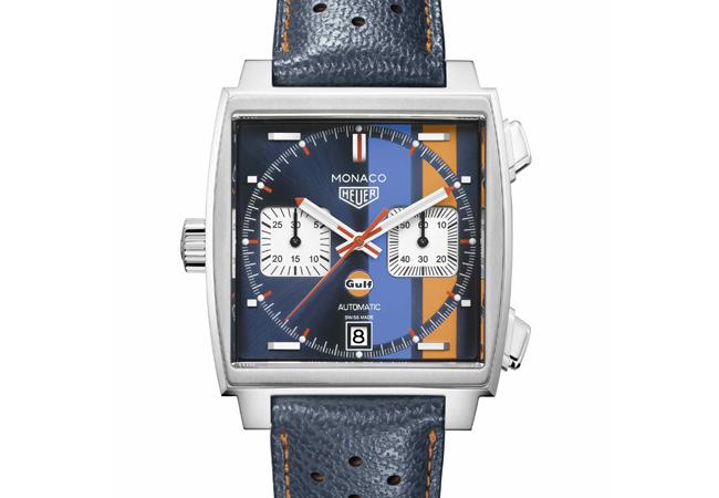 另一方面,今年TAG Heuer宣布與Gulf海灣石油簽署全球合作協議,並推出聯名錶款Monaco Gulf特別版腕錶,建議售價NT$191,800。此錶款採用經典「賽車」配色,以及Gulf海灣石油公司在1971年贊助史提夫麥昆(Steve McQueen)主演電影《極速狂飆(Le Mans)》所使用的經典標誌,例如錶面裝飾淡藍色和橘色條紋,6時位置亦飾有Gulf標誌。錶殼採用與當年相同的39毫米尺寸、左側錶冠、神秘的藍綠色錶面,搭配白色雙眼計時盤、6時位置日期窗、橫向菱形時標以及復古Heuer品牌標誌,內部則搭載Calibre 11自動計時機芯,並具有100米防水性能,忠實還原Monaco的特質。