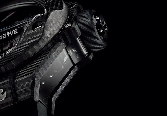 全新的MP-11同步推出藍寶石水晶與碳纖維款式,而此次主要討論的碳纖維款式,也是挑戰鐘錶產業的首度製作法。硬度高、質量輕、耐腐蝕,也不會引起金屬過敏反應的碳纖維材質,在近幾年因為大錶風潮而被引入腕錶產業中,以求為腕錶帶來更好的配戴感。向來對於材質有著極為寬廣胸懷的宇舶,採用碳纖維做錶殼也很理所當然的。然而,一如前言提及的機芯結構,稍加想像一下,串聯成筒狀的發條盒橫躺在盤狀的機芯上,側面看來有點類似蝸牛,面盤高低落差甚大,因此錶殼形狀也勢必要採更立體的結構。