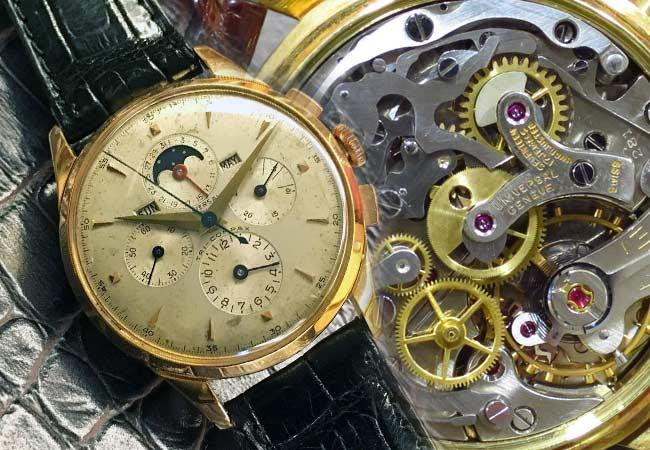 再來是這款七針三窗的宇宙全曆計時碼錶,這在1940年代算是很複雜的功能,繁而不亂的面盤布局也是這款腕錶出色的地方,即使宇宙錶現在並不出名,但在那年代可是擲地有聲,在上個世紀末,被歸為必須收藏的經典老錶之一。