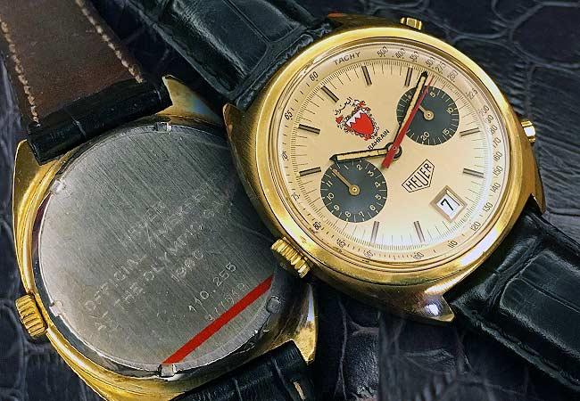 接下來的這款豪雅奧運特別版也是相當稀有,“那一年奧運很特別!”葉振東埋下伏筆說。這是1980年豪雅為波斯灣島國巴林的奧運代表團所做的特別版,當年是莫斯科奧運,可是1979年蘇聯入侵阿富汗,因此很多國家抵制當年奧運,巴林也是其中之一,但錶已經做出來了。這錶不僅有歷史意義,裡面還裝載了瑞士最早的自動上鍊計時機芯之一的Cal.12,自動盤在機芯夾層,結構很特殊,錶冠與計時按把分據兩側是這機芯的特徵!