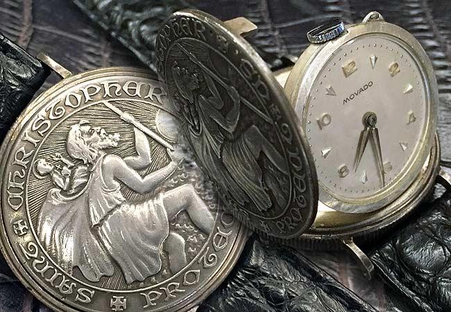 最後介紹的這款刻劃了基督教的故事。MOVADO Saint Christopher腕錶是硬幣錶的一種,挖空硬幣後,再將錶置入其中,硬幣就變成錶殼與上揭蓋,這款則再加上錶耳,成為腕錶。傳說聖克里斯多福(Saint Christopher)曾揹著耶穌變成的幼兒過河,因而後來成為旅人的保護者;這款錶就描述了這個故事。“玩古董錶也懂了很多人文歷史”葉振東賞玩著錶款說。