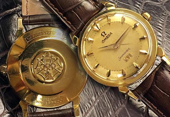 講到奧運當然不能忘記歐米茄,這款是為1956年第16屆奧運(澳洲墨爾本)所做的特別版,收藏家暱稱為海馬16,折曲的錶耳(曲耳)、金質蒼蠅字時標、多邊形錶冠,以及6時位置的XVI(16)是這款腕錶的特點,壓入式底蓋上還有奧運金獅五環火炬十字標幟,裡面裝的是歐米茄471自動機芯。