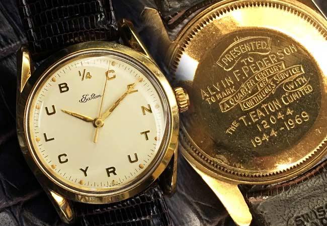 勞力士這款則是Eaton百貨公司送給服務25周年(即面盤上寫的1/4世紀)員工的禮物。葉振東啜了一口咖啡說“一個人在公司幹了這麼久,很感人。”年輕人大概很難想像在一家公司待25年是什麼情況吧?