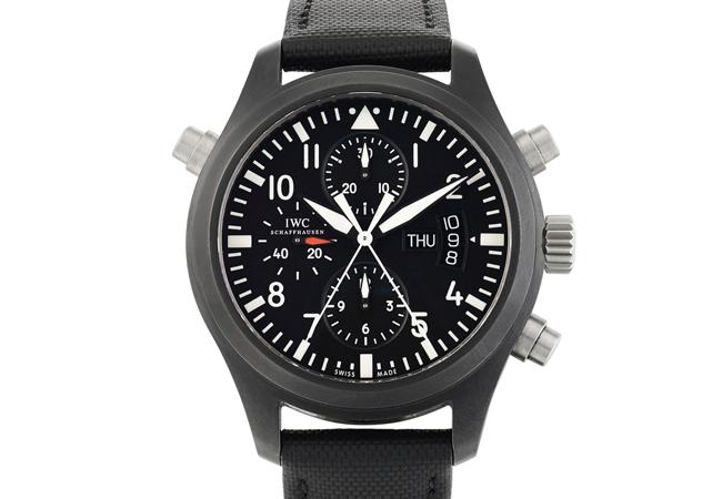 這款結合黑色陶瓷與鈦金屬的飛行錶剛好說明了IWC的兩項第一;IWC分別在1980年首次將鈦金屬引入製錶界,並於1986年首創以氧化鋯陶瓷做錶殼。受歡迎的飛行錶內裝由ETA 7750改裝而來的追針機芯,價格較自製追針更為親民。
