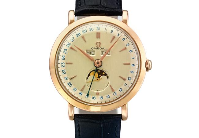 其他附註:直徑38mm 18K玫瑰金錶殼,約1948年製,27 DL PC手動機芯,日期、星期、月份、月相顯示。