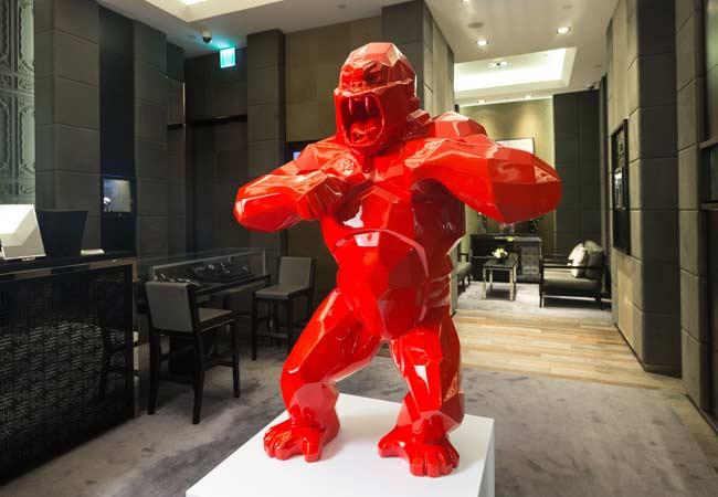 RICHARD ORLINSKI經典代表作之一“WILD KONG”創作於2010年,以天然樹脂為原料,市價約台幣二百萬元。150cm 幾乎與人同高的兇猛金剛張嘴露出銳利尖牙,憤怒雙拳捶擊胸膛發出怒吼。以天生野性(Born Wild)為創作靈感,作品充滿生命力,鮮豔色彩的金剛以充滿力量的站姿宣告主權,傳遞人類對於天地百獸應有的敬畏之意。