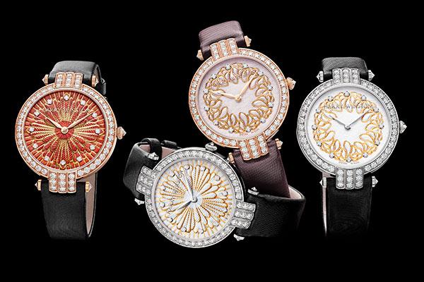 面盤上的浮雕以凹凸起伏的方式交錯呈現,讓紅色、銀灰錶盤上的星形圖案,以及純白、淡粉面盤上藤蔓般纏繞的花卉圖形,都展現出立體的紋路以及深淺的層次感。四款手錶的面盤上都鑲嵌了十二顆鑽石做為時標,錶圈和錶耳也一如Premier系列以往的呈現,都鑲滿圓鑽裝飾,而且搭載自動上鍊機芯,不只是面盤很有工藝價值,比起一般女錶機芯也是高檔次的提升。