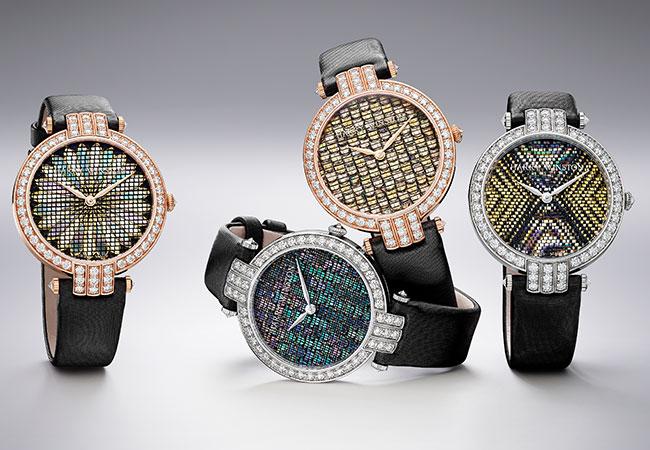 2016年時海瑞溫斯頓也曾將源自日本的古老螺鈿工藝,運用在面盤上,從構思到研發歷時一年半的時間,打造出以金線與天然銀色珍珠母貝薄片交疊織造的面盤,這也是錶界首見將這兩種材質結合的編織技法。