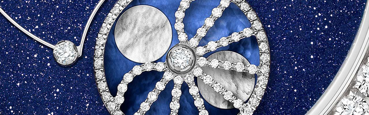 為了讓月相盤更為立體,海瑞溫斯頓將月相盤的拱形鑽石格柵以拱起方式打造,拉出月相盤間的高低差,不規格線條的鑽石格柵,搭配上滿月看起來彷彿像隻星空下的華美蜘蛛,伏動在絲綢般光澤的湛藍月相盤上。