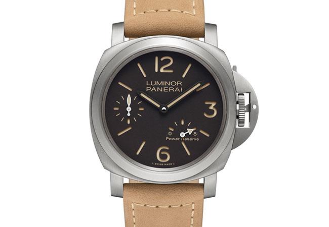 第三款新作是Luminor 8 Days Power Reserve Titanio 八日動力儲存鈦金屬腕錶 (PAM00797) 與精鋼版腕錶的功能和設計如出一轍,但錶殼和錶冠保護裝置均以磨砂鈦金屬鑄造,表面和邊緣經分別呈磨砂及拋光效果。錶殼採用五級鈦合金, 機械性能和防鏽能力絕佳,重量亦比精鋼輕約四成。這款型號的色調配搭亦別出心裁,糅合深淺不一的棕色︰深棕色錶盤配搭未經加工處理的淺棕色天然皮革錶帶,與米色Super-LumiNova® 時標和錶帶縫線相得益彰。