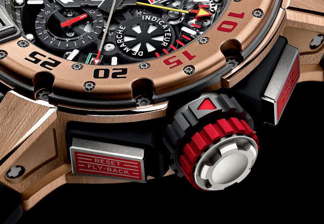 此外,RM 032還有特殊的安全裝置;在錶冠上可以看到紅色和黑色兩個外環,紅色用來旋轉錶冠,而黑色則是安全鎖定裝置,當黑色部分出現紅色三角形時,表示計時按把、錶冠皆被鎖定,不會有誤觸的危險。若是出現綠色三角形的時候,則表示各項功能都可操作。