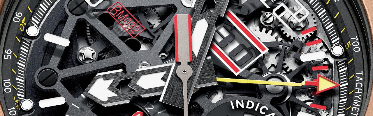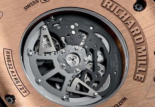 RM 028和RM 032的自動機芯都配置了RICHARD MILLE獨家的可變幾何結構自動盤,鏤空的自動盤設有可以調整六段位置的18K白金小翼,不同的小翼位置可以改變自動盤的配重,進而提高或減緩上鍊效率。錶主的日常生活若是比較動態的,可以調到上鍊較緩的位置;如果屬於比較靜態的,則可做上鍊效率高的設定。這是一項相當個人化的貼心設計。
