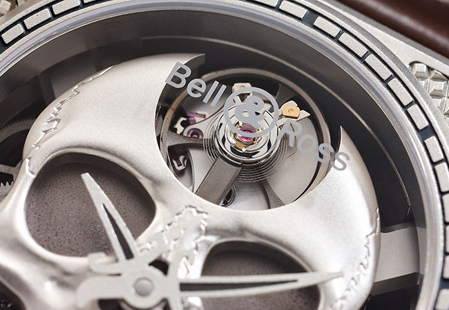 巴黎釘紋雕花錶殼,骷髏則如先前的BR 01 Burning一般,採用立體浮雕的形式呈現。其中巧妙在於在上鍊結構中,加入一枚撥動齒輪,在轉動錶冠時,也啟動齒輪能帶動骷髏下顎開闔。結構理論說破後,看似簡單,但所帶來的趣味卻令人動心。拿到手時,確實引人不時上鍊,欣賞作動。內裝BR.206手上鍊機芯,這是柏萊士全新訂製的專屬機芯,骷髏形狀的基板,架構起所有齒輪系,並以兩片鏤空扇形夾板為支架與錶殼連結,巧妙與錶正面,延伸至外鎖螺絲的骨頭裝飾連結,讓浮雕的骷髏頭,似有若無地浮在錶殼之中,說白了,這是鏤空機芯的體,但表現出的強烈風格也著實令人印象深刻。