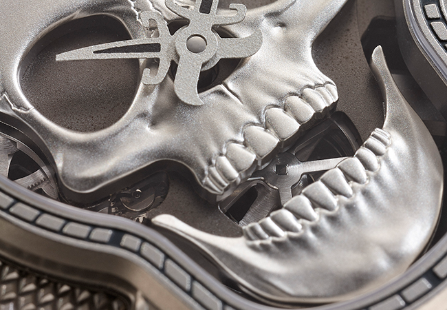 獨特的機芯形式,也影響了錶款的另一主視覺—骷髏腦門上門戶大開的擺輪。雖然錶殼尺寸達46mm,但其實機芯結構只縮限中央骷髏大小,輪系結構的配置實則不若想像寬裕。左右兩邊縮限,而中央骷髏頭機芯六點鐘位置保留給發條盒與下顎開闔輪系後,擺輪很自然地便移置十二點鐘位置(骷髏左臉後方則可見到走時輪系)。順應如此配置的必然,柏萊士的設計師索性也將骷髏腦門開了一口,讓擺輪躍然眼前,為腕錶帶來更炫目的視覺設計。