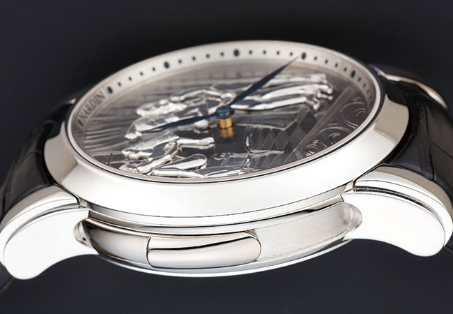 而如何調整出適當的速度,讓所有報時聲響不會連的太密,難以區分,或是間隔太久,壞了節奏感,都是製錶師在製作調整時,必須要考慮且拿捏純熟的一環。報時結構主要是藉由一組蝸形凸輪記憶當下時間,並以一組探測針讀取凸輪所顯示的時間,並讓齒輪能夠敲擊出當下聲響。而加入活動人偶之後,這組凸輪,也成為了驅動人偶運作的依據,另有一組輪系連動人偶,讓三問與人偶同步運作。而在這些機械結構之外,還有就是不鏽鋼音錘敲擊音簧時的落點,如何會發出最好的聲音,如何以錶殼內空間為共鳴箱,讓聲音加大擴散等等,這又是更需要仔細規劃計算調整,甚至考驗些美感的部分了。三問的困難,就在這層層的連動之中。