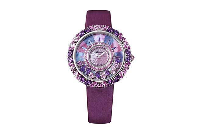 Happy Dreams珠寶花卉腕錶18K白金鑲嵌總重4.14克拉粉色剛玉與2.18克拉紫水晶,鑲嵌花漾式的珍珠母貝錶盤,錶圈鑲嵌粉色與紫色梨形切割剛玉或紫水晶,搭配5顆梨形切割滑動粉色剛玉與5顆滑動紫水晶,為此經典系列商品增添彌足珍貴與浪漫優雅的全新風情。此外,Happy Diamonds系列內的Happy Precious項鍊靈感源自珍愛蕭邦系列中,由象徵花冠造型,中心單顆滑動鑽石優雅的地在兩片藍寶石水晶間快樂飛舞,圍繞著鑲嵌明亮式切割與梨形切割鑽石項鍊,營造浪漫與優雅設計的完美邂逅。