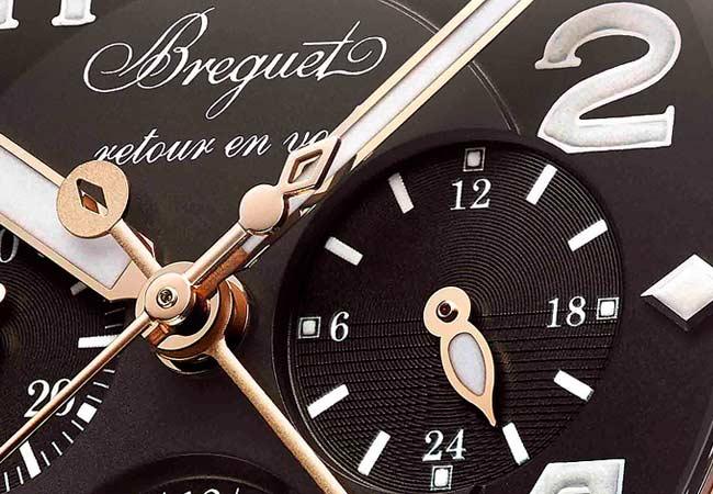 黑色錶盤,鐫刻Breguet隱形簽名。刻度環採用阿拉伯數字時標,帶螢光點。3點鐘位置設有晝夜顯示,6點鐘位置設有12小時計時器和日期視窗 ,9點鐘位置設有小秒針,中央位置設有分鐘計時器。配有螢光指標和圓點刻度。