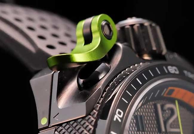 看到Bolt-68 Racing計時碼錶後,那種視覺震撼很容易讓人聯想到品牌名稱——炸彈錶。將錶冠、計時按把移到11到1時之間位置的牛頭型(Bullhead)配置還不足為奇,畢竟這在上個世紀也有其他品牌做過;不過,畫龍點睛的是有如板機造型的計時啟動/停止按把。如果你以為這只是為了好看的話,那就小看了炸彈錶的設計師,人家可是運用了槓桿原理與人體工學,讓計時的啟動與停止更輕鬆自在。