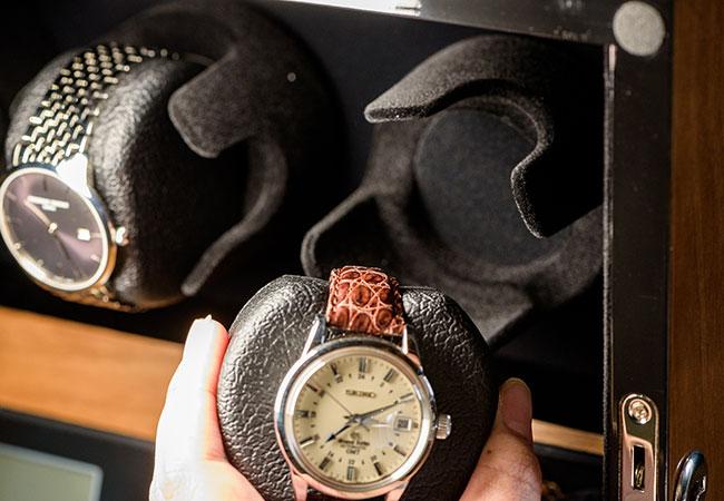 我們試著將需要上鍊的腕錶一個個裝上錶枕,這個時候可以用手握住錶枕的兩側位置,再將裝有腕錶的錶枕放進轉座,這麼一來,便不會壓傷錶枕上下兩端的錶帶。接下來,就可以藉由下方LCD控制面板來設定轉動,在BLDC無刷馬達的驅動下,上方四個轉座就會自行運轉,開始為腕錶上鍊囉!