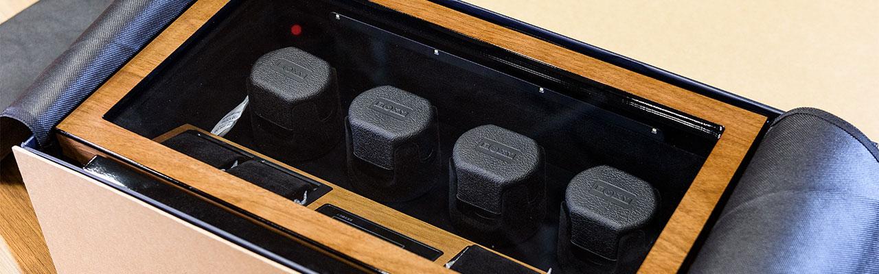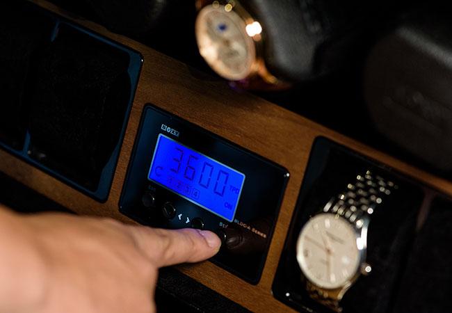 為了能夠好好地展示盒中的愛錶身影,上鍊盒外門是以玻璃材質打造,向左側拉開後便能清楚看見整個上鍊盒的內部結構。盒內由中心線一分為二,上半部直線排列四個上鍊轉座,也就是說,這款上鍊盒可以同時為四只自動錶持續上鍊;下半部則直線排列四個單獨錶枕,提供四只腕錶的收藏空間,並以傾斜45度角的穩固設計收納和保護愛錶。最後,位於下方正中央的則是可以設定所有上鍊功能的LCD控制面板,單一面板的操作模式相對簡單,對使用者來說也容易上手。
