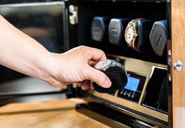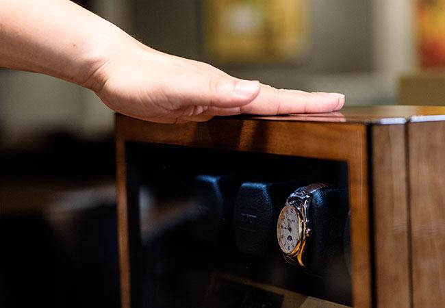 透過透明玻璃門,各只腕錶的優美姿態盡現,而所有上鍊中腕錶的狀態也一目了然。特別的是,每當上鍊盒進入休眠狀態時,只要輕輕拍打盒身就能再次啟動內裝的LED燈裝置,在光線照射下再搭配轉座不時轉動的動態視感,愛錶們的所有細節顯得更加生動清晰,這人性化的設置更方便擁有者可以隨時品鑑置放於其中的各件藏品。而上鍊盒右側也專門設置了一個鎖孔,必須以匹配的鑰匙才能開啟,由此確保上鍊盒的安全性。