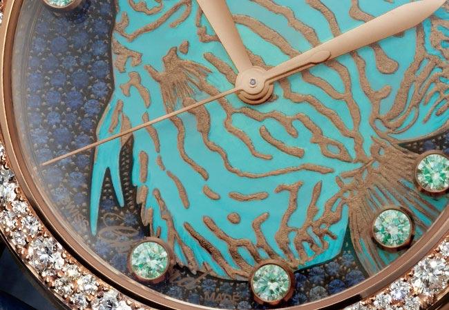 顧名思義,Happy Fish以魚為主題創作,新款以雪花式鑲嵌的漸變藍寶石營造出海洋背景,面盤中央以金質結合珍珠母貝打造華美海魚,呈現魚身的珍珠母貝在日光的照射下綻放出柔美光澤,魚紋由手工鋪貼的金葉描繪,魚眼則以紅玉點睛。而面盤中少不了著名的Happy Diamonds,七顆滑動鑽石在藍寶石水晶盤中旋動,彷彿泡沫一樣包圍著精緻主角。