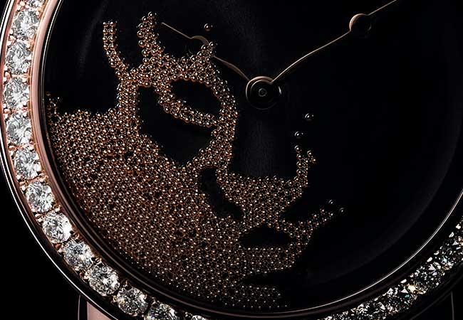 而這次工藝上最值得探究,也是最大功臣,在於其採用了兩個全新研發的獨家技術。其一是面盤上採用了肉眼難以察覺的隱形軌道,令多達九百顆的金珠能夠短暫地停留於其上,進而排列出預計呈現出的完整圖案,也就是最終呈現的美洲豹臉部圖騰。其二是藉由一種高濃度的無色透明液體,令金珠在黏附狀態時能夠停留較久的時間,因此造就金珠緩慢的流動速度,這緩緩流動的樣貌與一般快速滾動截然不同,更優雅符合美洲豹的形象,也更加彰顯沙漏般的動態視感。借重這兩項專利,整體的視覺效果才得以如此精緻華麗,令人驚喜。