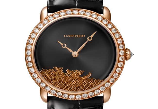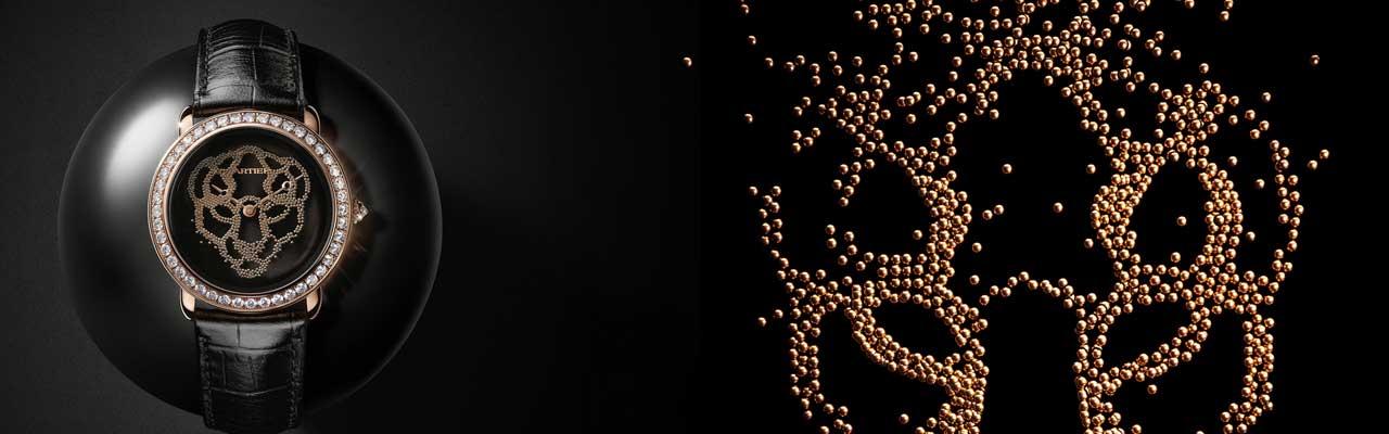 當腕錶平放時,金珠匯聚而集結成的獸面浮出;而當腕錶直立時,金珠緩緩滑落,便會各自散落在面盤底部,這時圖案也逐漸消失,如此特別的呈現方式,極具有藝術性效果,也充分展現出卡地亞在工藝上的出色創意。