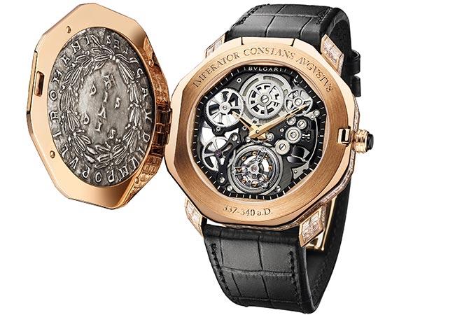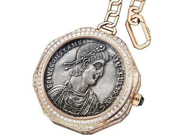 一枚古羅馬銀幣,上面刻有古羅馬皇帝君士坦丁二世的人像,鑄造於公元337至340年之間,時間所累積成的價值,就是這枚Octo Finissimo Tourbillon超薄鏤空陀飛輪古幣懷錶代表的重要意義。寶格麗第三代傳人Nicola Bulgari,本身就是一位古董錢幣收藏家,收藏了數量龐大的古希臘羅馬錢幣,過去寶格麗多拿來作為珠寶設計的元素之一,這次所使用的古羅馬銀幣來自君士坦丁二世,不僅在時代上具有代表性,甚至尺寸夠大、保存狀態極佳,都是讓該古幣價值連城、甚至是世界各大收藏家的狙擊目標,更別說首次融合到腕錶之中,讓古幣能有了絕佳的展示平台。