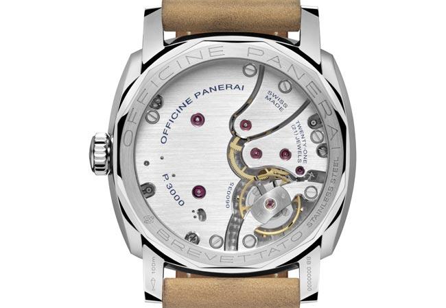 由沛納海自行研發、2011年發表的P.3000手上鍊機芯,成為這只復古風格腕錶的動力來源。其直徑為16½法分、厚度則為5.3毫米,每小時21,600轉。相較於最初的機芯夾板設計,如今廠方已經將雙夾板結構改為三片式設計,線條也更為優美。而雙發條盒帶來了三日動力儲存,同時機芯還能在不影響分針或腕錶運行下,進行短時針的正逆向快調,相當便利。這一切的一切,都能透過藍寶石水晶玻璃底蓋而一覽無遺。但可別忘了:這枚腕錶的面盤,同時也是整只腕錶的靈魂所在。帶有裝飾藝術Art deco氣息的阿拉伯數字,搭配了劍形指針與軌道式分鐘刻度。
