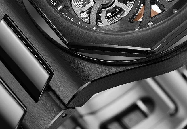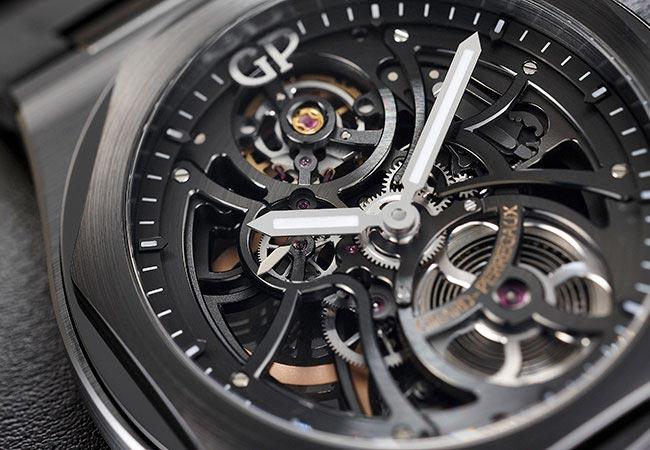 面盤上只保留了外圍的分鐘刻度圈以及12點位置的GP標誌,機芯的機板、錶橋和自動盤都採用了鏤空設計。無論通過正面和背面,我們都能夠欣賞到機芯內部具建築式美感的精巧結構,以及每一處細節上來自品牌匠師們精心的手工修飾。相當特別的是,這款機芯的夾板也使用了黑色PVD處理,如此一來,盤面便與全黑的腕錶外觀相呼應,如同黑夜一般,呈現All Black的一致調性。這樣的帥氣視感搭上陶瓷材質輕盈、舒適的手感特性,更加地出彩誘人了。