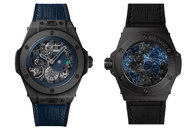 這款P2P腕錶延續Big Bang系列的創新設計,45毫米微噴黑色陶瓷錶殼。然而宇舶錶所採用的陶瓷並非一般陶器所使用的陶土,而是一種以極高溫壓製二氧化鋯而形成的高科技物料,搭載HUB1201自製機芯,這款鏤空機芯提供長達10天的動力儲存。而「10」這個數字亦非偶然—「10」乃代表Bitcoin問世10周年。210枚腕錶皆獨一無二,每一枚都刻有以比特幣交易的認證編號。另一項取材自加密貨幣的元素是以比特幣為靈感的設計—以互相連接的電腦組成的虛擬貨幣交易網絡圖樣,印製在藍色小牛皮配黑色橡膠錶帶上。