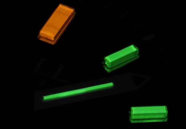 不論陸上漆黑一片或深海低能見度,全新勇悍專業潛水錶的單向轉動錶圈鑲嵌了一顆自體發光微型氣燈,可清晰顯示已下潛時間。錶盤上的小時刻度以立體的棒狀自體發光微型氣燈組成,不同的尺寸及顏色,構成亮眼的夜視效果。時、分、秒針上同樣配備這種不需外在光源而能自體發光的微型氣燈,黑暗環境下,讀取時間依然輕鬆容易。